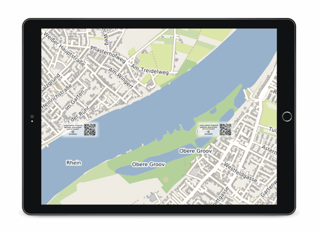 Thanks to scale-dependent display, the appropriate details are visible depending on the zoom level. Free access is possible up to a scale of approx. 1:25,000; beyond that, a watermark appears. For use in larger scales, our OWS Premium Service can be used. This offers greater stability and better performance, as the circle of users is limited and a more powerful server is used.