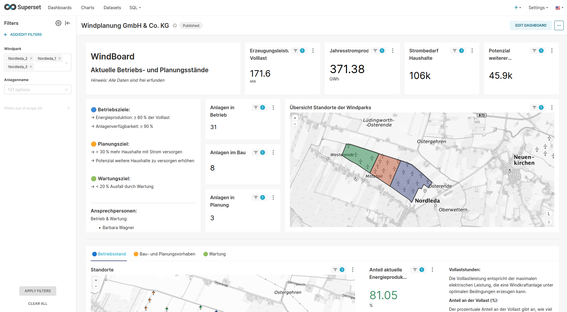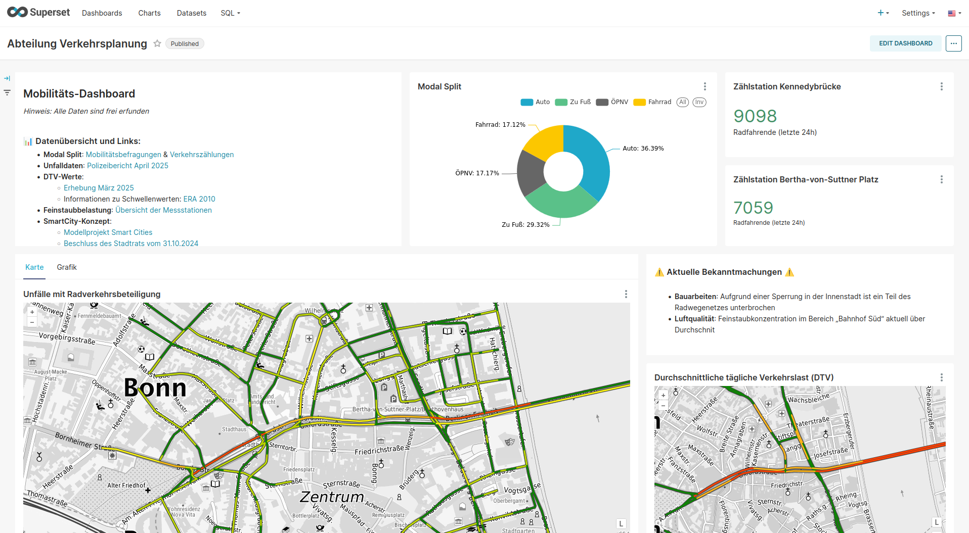 The possible applications of Superset are versatile and are based on the needs of the users – whether in companies, in administration or in research. Areas of application include the analysis of environmental data, traffic flows, construction progress, production figures and much more.