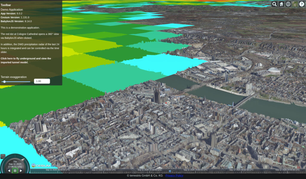 Video of a CesiumJS application: Interactive zoom from the entire globe to a point in Cologne, in which a navigable 360° panorama of the forecourt of Cologne Cathedral is displayed. The digital orthophotos visible in the meantime are queried from a WebMapService (WMS) and projected onto the globe.