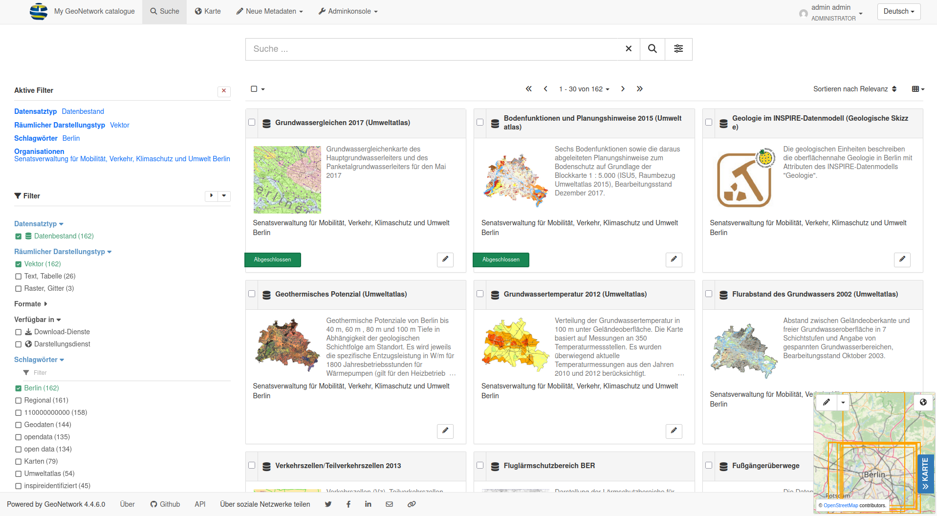 GeoNetwork supports the simple collection, maintenance, and publication of metadata for geodata and services. It is based on open standards such as ISO19115, ISO19119, INSPIRE, and OGC and offers extensive search functions, individual views, and interfaces for further processing. Both layers and services, maps, or non-geographic datasets can be described in the catalog. Templates and directories are available for this purpose.