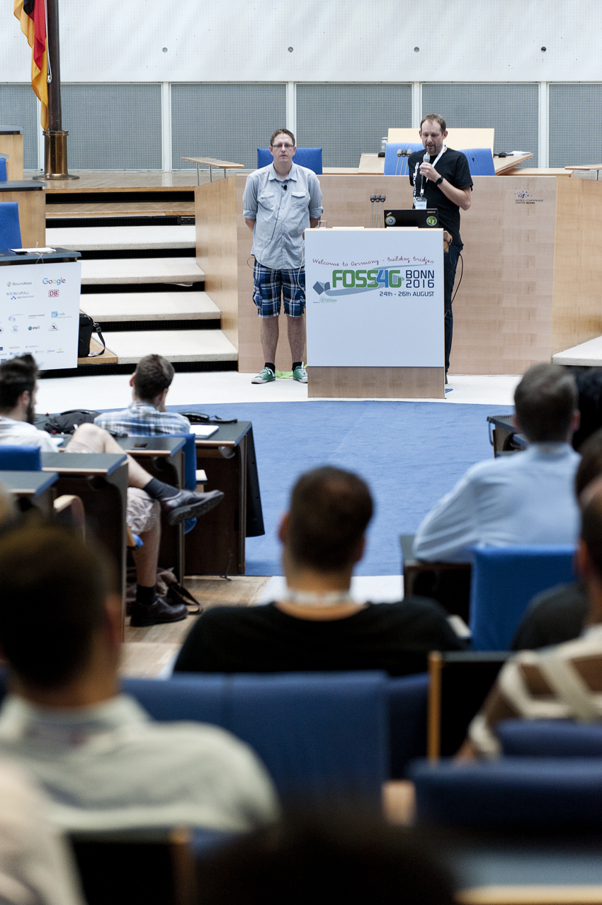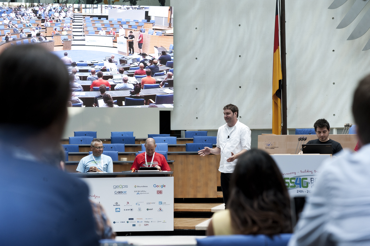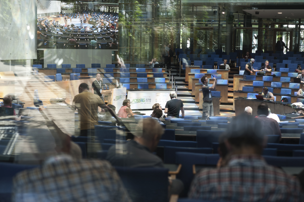 Der ehemalige Plenarsaal des deutschen Bundestages im World Conference Center Bonn bildete anschließend den optimalen Mittelpunkt für den Kern der Konferenz vom 24.08. bis 26.08., in dem eine Fülle von Vorträgen präsentiert wurden, welche auch im Nachgang als Video betrachtet werden können: http://video.foss4g.org/foss4g2016/videos/index.php